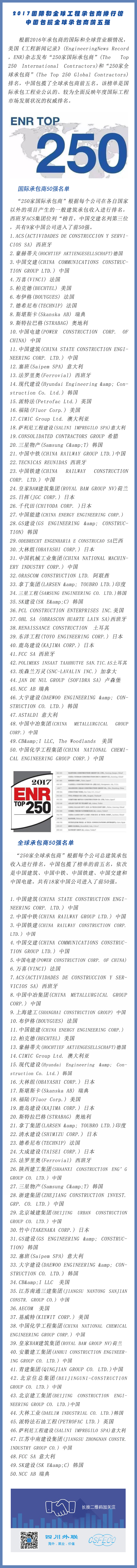 中國包攬了全球承包商前五名。該榜單是國際承包工程業(yè)公認的、較為全面反映年度國際工程市場發(fā)展?fàn)顩r的權(quán)威排名。