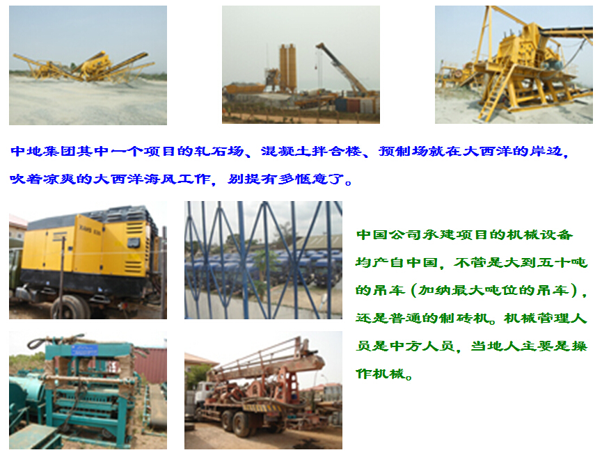 中地集團其中一個項目的軋石場、混凝土拌合樓、預(yù)制場就在大西洋的岸邊,吹著涼爽的大西洋海風(fēng)工作,別提有多愜意了。中國公司承建項目的機械設(shè)備均產(chǎn)自中國,不管是大到五十噸的吊車(加納最大噸位的吊車),還是普通的制磚機。機械管理人員是中方人員,當(dāng)?shù)厝酥饕遣僮鳈C械。