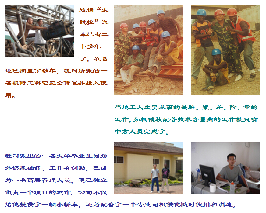 這輛“太脫拉”汽車已有二十多年了,在基地已閑置了多年,我司所派的一名機修工將它完全修復(fù)并投入使用。當(dāng)?shù)毓と酥饕獜氖碌氖桥K、累、差、險、重的工作,如機械裝配等技術(shù)含量高的工作就只有中方人員完成了。我司派出的一名大學(xué)畢業(yè)生因為外語基礎(chǔ)好、工作有創(chuàng)勁,已成為一名高層管理人員,現(xiàn)已獨立負責(zé)一個項目的運作。公司不僅給他提供了一輛小轎車,還為配備了一個專業(yè)司機供他隨時使用和調(diào)遣。我司人員在國外考察期間與派出人員在中地集團加納項目經(jīng)理部基地合影。這些由我司派出的人員已成為中地集團加納項目經(jīng)理部的中高層管理人員。
