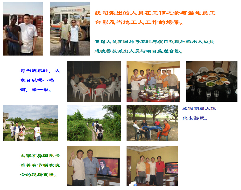 我司派出的人員在工作之余與當(dāng)?shù)貑T工合影及當(dāng)?shù)毓と斯ぷ鞯膱鼍?。我司人員在國外考察時與項目監(jiān)理和派出人員共進晚餐及派出人員與項目監(jiān)理合影。每當(dāng)周末時,大家可以喝一喝酒,聚一聚。放假期間大伙出去游玩。
