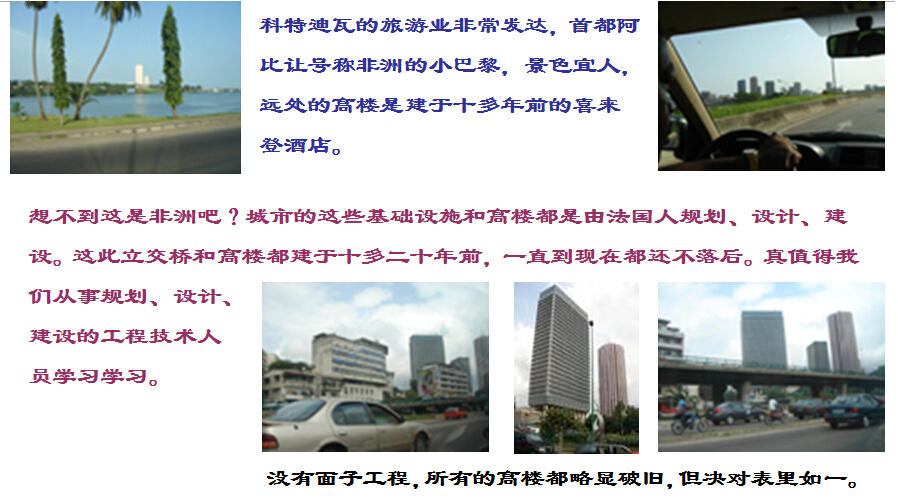 科特迪瓦的旅游業(yè)非常發(fā)達(dá),首都阿比讓號(hào)稱非洲的小巴黎,景色宜人,遠(yuǎn)處的高樓是建于十多年前的喜來登酒店。城市的基礎(chǔ)設(shè)施和高樓都是由法國人規(guī)劃、設(shè)計(jì)、建設(shè)。立交橋和高樓都建于十多二十年前,一直到現(xiàn)在都還不落后。真值得我們從事規(guī)劃、設(shè)計(jì)、建設(shè)的工程技術(shù)人員學(xué)習(xí)學(xué)習(xí)。