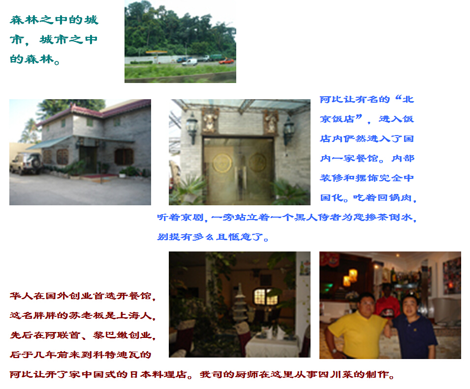 阿比讓有名的“北京飯店”,進(jìn)入飯店內(nèi)儼然進(jìn)入了國內(nèi)一家餐館。內(nèi)部裝修和擺飾完全中國化。吃著回鍋肉,聽著京劇,一旁站立著一個(gè)黑人侍者為您摻茶倒水,別提有多么且愜意了。華人在國外創(chuàng)業(yè)首選開餐館,這名胖胖的蘇老板是上海人,先后在阿聯(lián)酋、黎巴嫩創(chuàng)業(yè),后于幾年前來到科特迪瓦的阿比讓開了家中國式的日本料理店。我司的廚師在這里從事四川菜的制作。