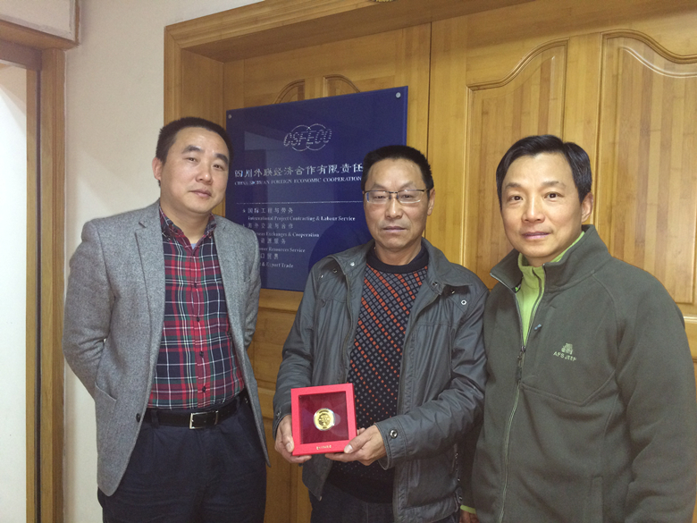 2016年猴年新春伊始,四川外聯(lián)經(jīng)濟(jì)合作有限責(zé)任公司對首位陪伴公司十年海外發(fā)展的員工黃成良先生給予獎勵,授予他一枚“十年海外貢獻(xiàn)獎”50克純金金幣獎?wù)拢?/p>